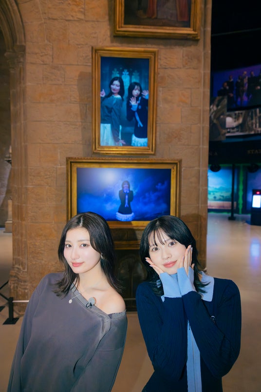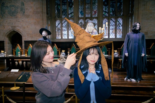「父の影響でハリー・ポッター作品に出会った」という桜田さんと、「一番好きな作品は『ハリー・ポッターと賢者の石』」と語る吉川さん。ファンになったきっかけを語りながら、大広間のセットへ。3月18日から始まる特別企画「ホグワーツからの招待状」で展開される<組分けの儀式>の話題におよび、新入生が所属する寮を決定する<組分けの儀式>ごっこで大盛り上がり。壁一面に飾られた肖像画のなかに入ることができる「動く肖像画体験」では、ハリーたち“新入生を迎える先輩”という設定で撮影ブースにてポージング。映し出された自分たちの姿に笑いあう場面も。