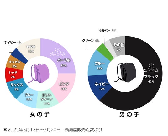 そうしたなか高島屋ではランドセルの人気カラーを中心に、店頭で約150種類、高島屋オンラインストアで約700種類の豊富なラインアップをご用意。本年はランキングに基づいた「人気カラー」が続々と登場します。さらに、お子様の“好き”を表現できるカスタマイズモデル、人気ブランドとのコラボレーションモデルも充実。今年は、「ランドセルご優待会」(※1)や百貨店でお得にお買物ができる「お買物クーポン」(※2)の配布も初めて実施いたします。