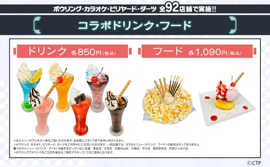 全国のボウリングとカラオケ、店舗でコラボメニューを販売いたします。各店舗で販売する対象メニューをご注文いただいたお客様には、コラボメニュー限定ノベルティをプレゼントいたします。
