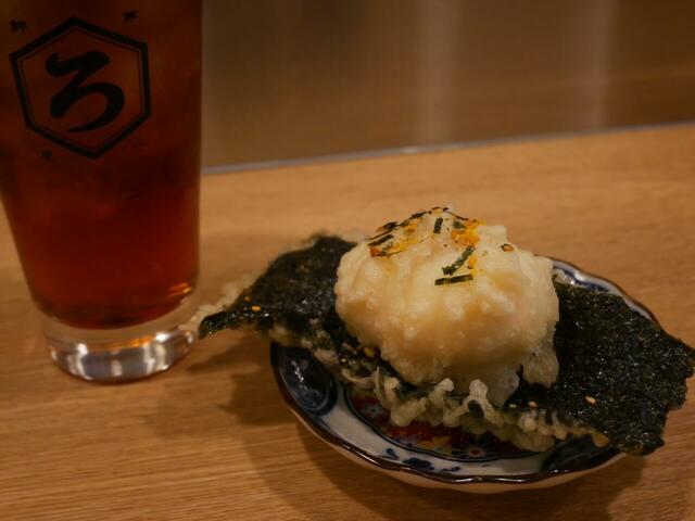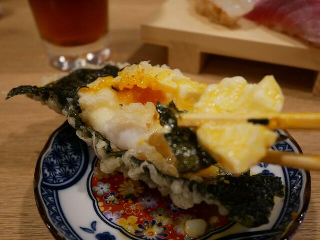 カウンターでかりっと揚げたての海苔天ぷらの上に、半熟卵の天ぷらがのっていて、海苔たまふりかけがアクセントになった、ボリューム満点の一品です。