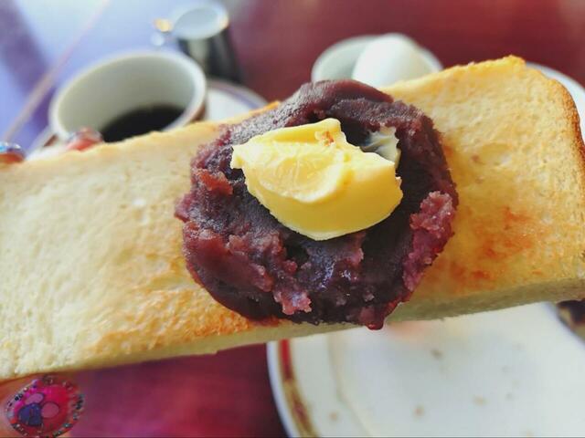 これは想定外だったのですが、バターとジャムのほかにこしあんもついてきました! Aセットを頼んだ場合、希望者にはこしあんが提供されるという超ナイスなサービスがあったのです。トーストにはバターもついているので、ここはやっぱり……