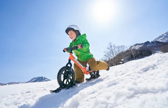 ストライダーは、決して自転車に乗るための単なるステップではありません。自転車と違い、もっと自由な乗り物です。芝生の上や、森の中、砂利道など、場所を選ばず楽しむことができます。それが例え雪の上であっても、ストライダーは子どもたちの好奇心と共に走り続けます。