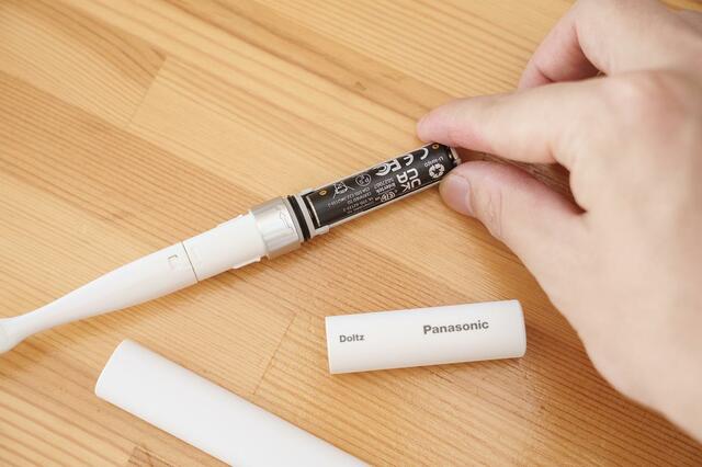 乾電池式なので、使う前に本体下部へ単四電池をセット。