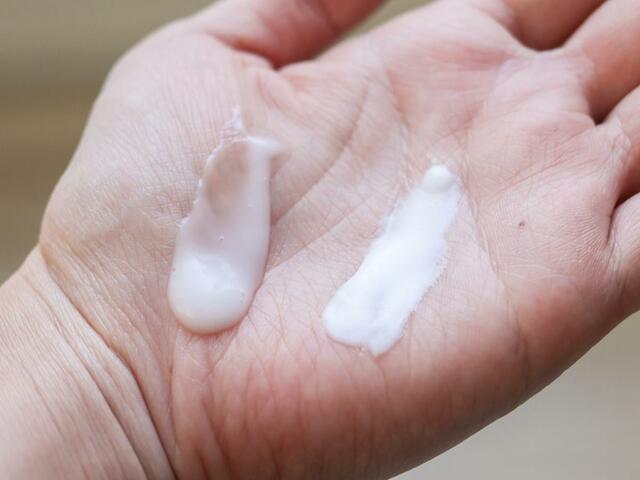 ちなみに、「高保湿クリーム ラップマスク」を絞って出たクリームと、「高保湿先行バリア乳液」のテクスチャを比べるとこんな感じ。