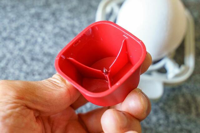 計量カップは単に水の量を測るだけでなく、卵に穴をあけられる「穴あけピン」を装備。調理前に穴をあけておくことで、殻を剥きやすくすることができるんです。