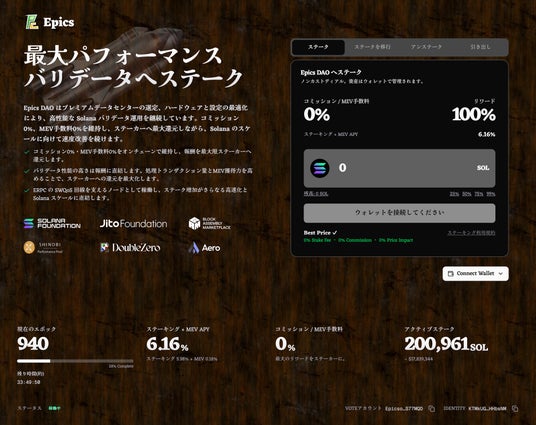 ELSOUL LABO B.V.(本社:オランダ・アムステルダム、代表取締役 CEO:川崎文武)および Validators DAO は、ERPC の SWQoS エンドポイントを支える中核ノードとして運用している Epics DAO バリデータのアクティブステークが 200,000 SOL(約 $17.8M)を突破したことをお知らせいたします。