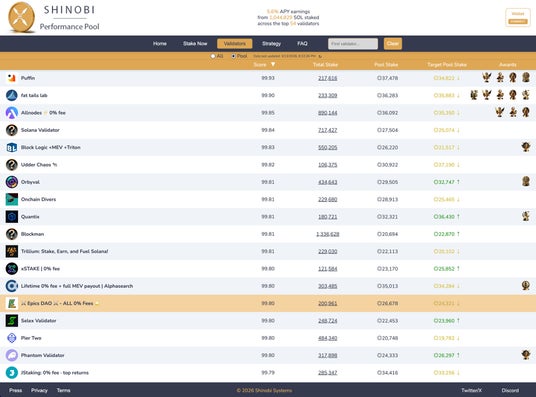 Epics DAO バリデータは 2 年間にわたりパフォーマンスの研究開発を積み重ねてきました。その成果が、Shinobi Performance Pool における TOP20 入りという形で客観的に表れています。