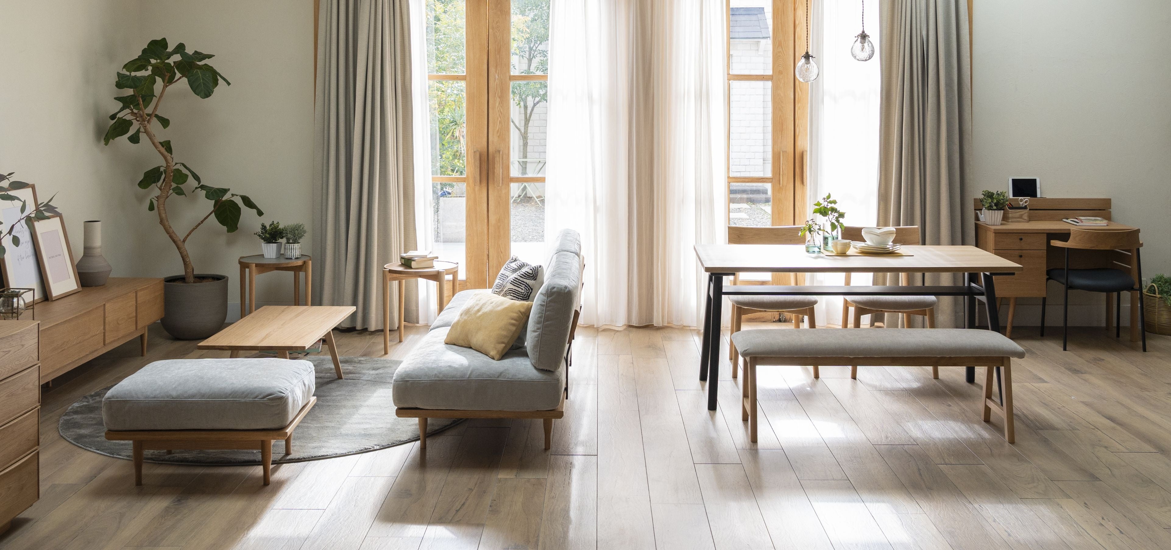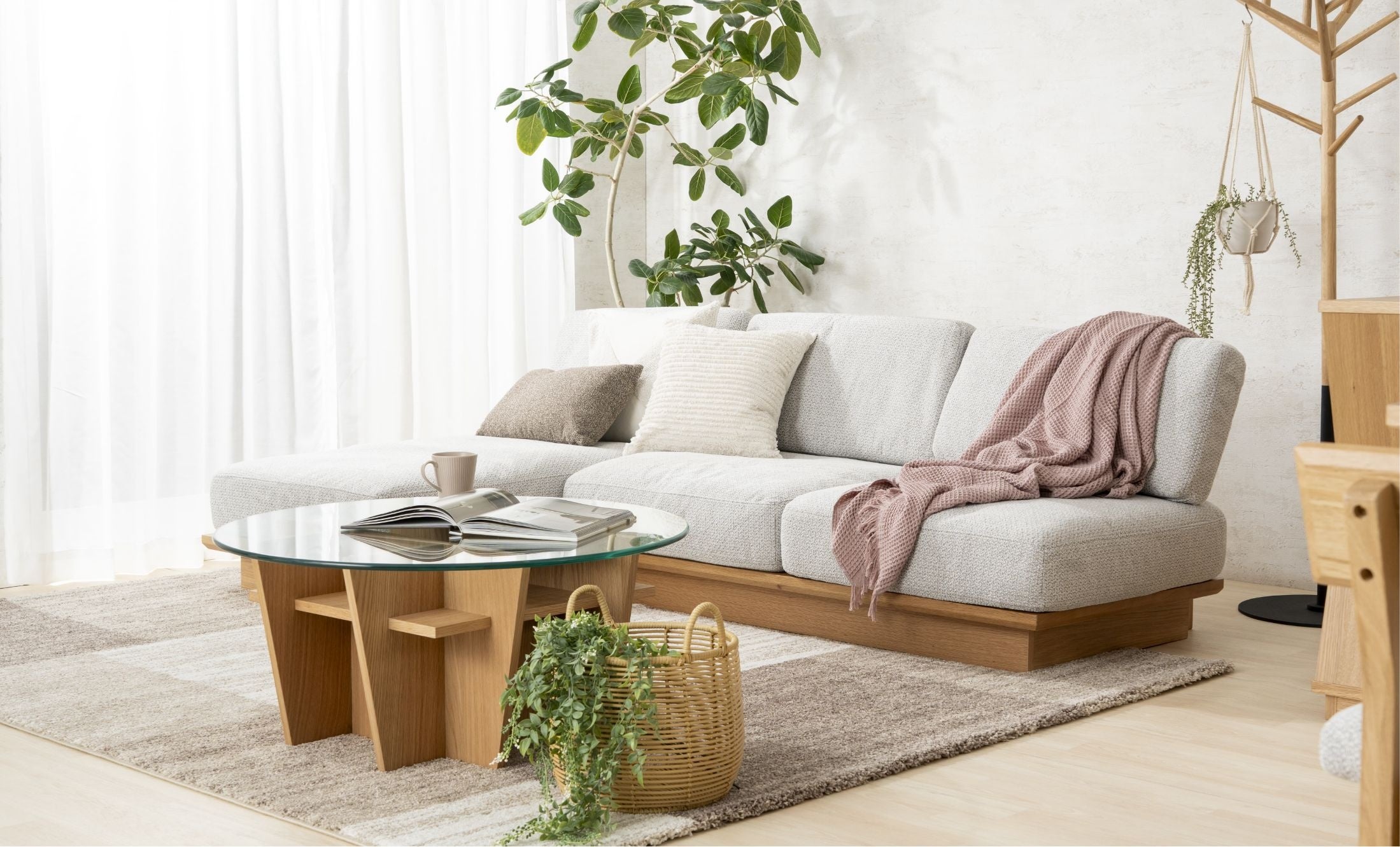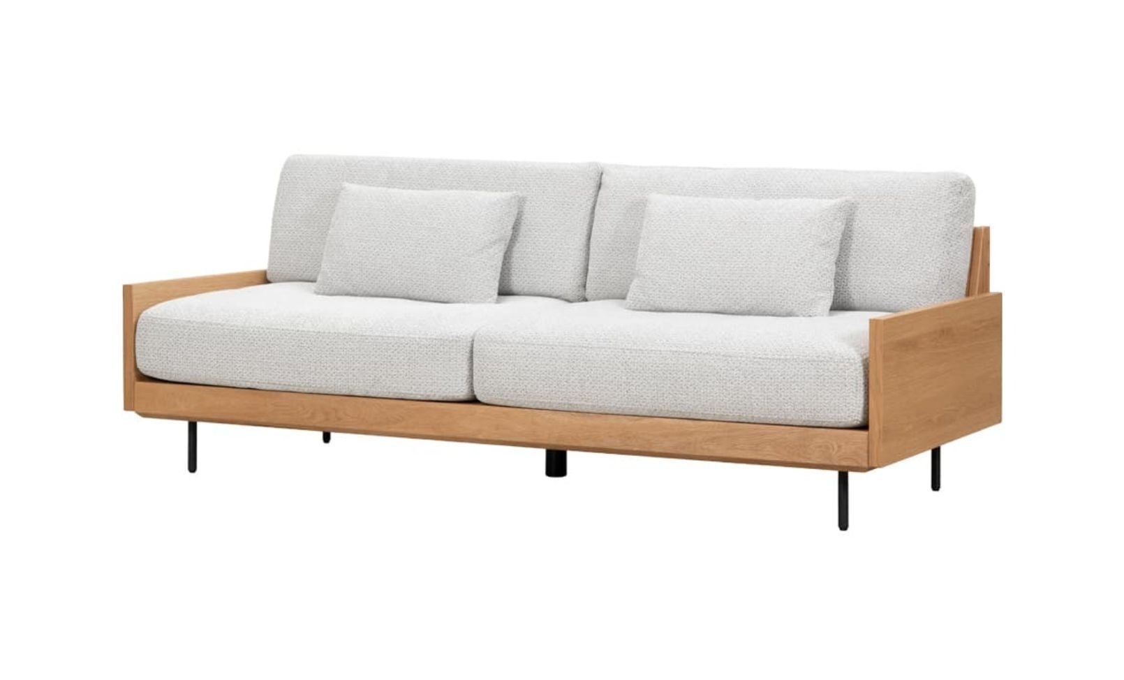 Balder-バルドル-ホワイトオーク材の木フレームがアクセントとなったデザイン。背面まで使える収納スペースを設けることで実用性を高め、細身の黒スチール脚が軽やかな存在感をつくり、角には面取り加工を施し全体をやわらかな印象に整えた。