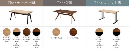 脚は、すっきりとしたテーパー脚、存在感のあるX脚、軽やかな印象のスリット脚の3タイプ。