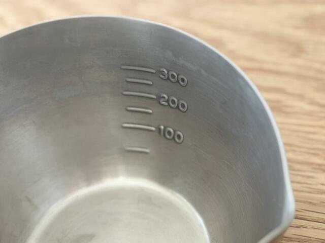 50mlから300mlまで測ることができる目盛り付きなこと。