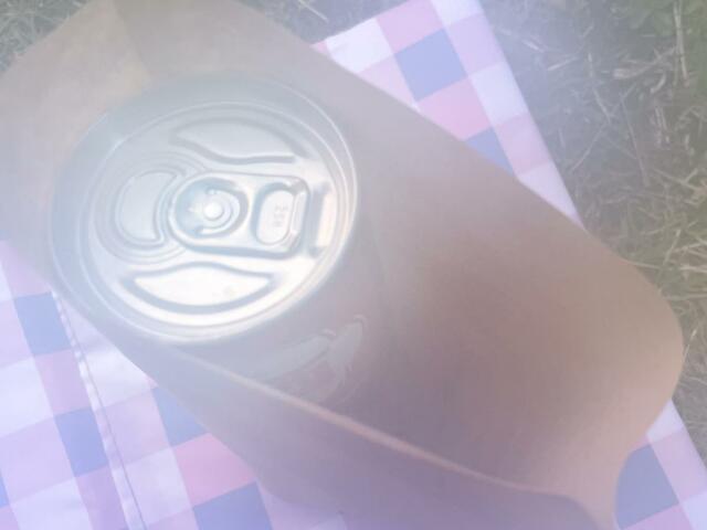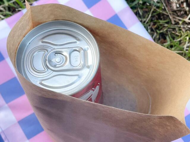 紙袋に水を注いだら、すぐに缶を紙袋に入れます。