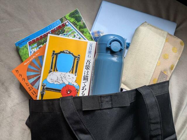ノート型PC、ポーチ、文庫本2冊、大き目の本1冊、小物を入れた巾着、水筒、ハンカチ、ティッシュ、スマートフォンなどを入れても、まだスペースがあります。