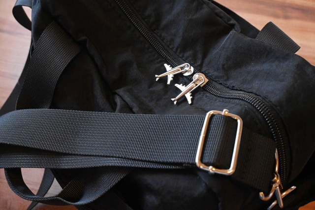 カラーはブラックのシンプルなデザインで、男女ともに使えそう。ファスナーの持ち手が飛行機になっているのも旅感あります。