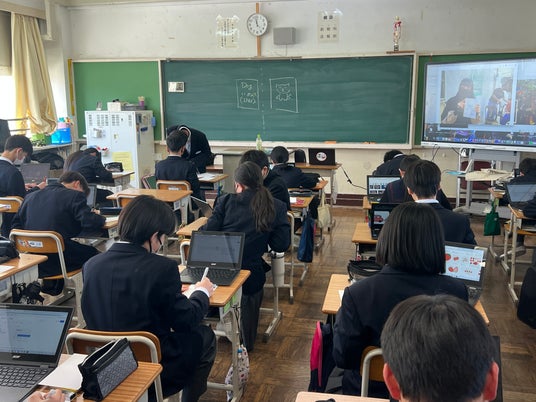 「それぞれが1ページずつ担当し、どんな絵がよいかを一人一人が一生懸命に考えていました。タブレット端末を使い、調べたことを自分なりにアレンジして仕上げました。絵が得意な生徒もいれば不得意な生徒もいますが、それぞれの思いを込めた作品になったと思います。世界がつながる経験は子どもたちの視野を広げ、今後の成長にもつながると感じました。」