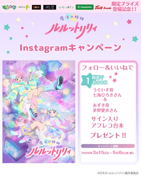 株式会社イオンファンタジー(本社:千葉県千葉市、代表取締役社長:藤原徳也、以下、当社)は、『魔法の姉妹ルルットリリィ』のプライズゲーム用景品「魔法の姉妹ルルットリリィ ちびぐるみ」を、「モーリーファンタジー」「PALO」をはじめとするアミューズメント施設、オンラインクレーンゲーム「モーリーオンライン」において、4月24日(金)より順次展開いたします。