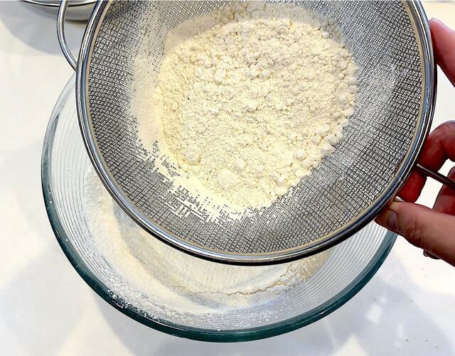 5. 粉ふるいを使って薄力粉をふるいながら入れ、ゴムベラでさっくりと全体に粉っぽさがなくなるまで混ぜる。