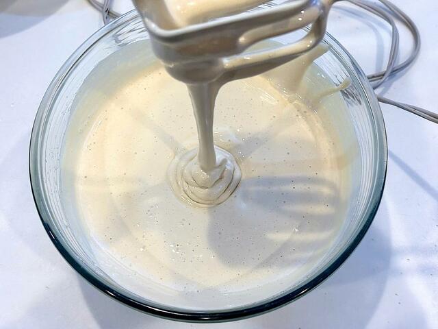 4. 全体がもったりとして、泡立て器を持ち上げるとリボン状に生地が落ちるまでしっかりと泡立てる(5分くらい)。