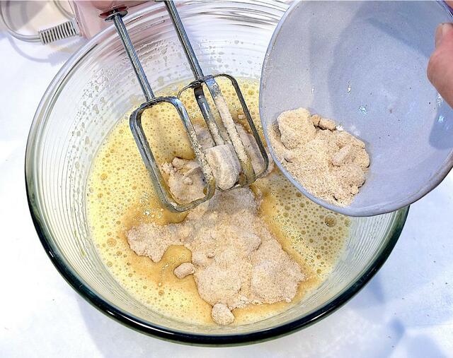 3. 砂糖を2〜3回に分けて加えてよく混ぜる。