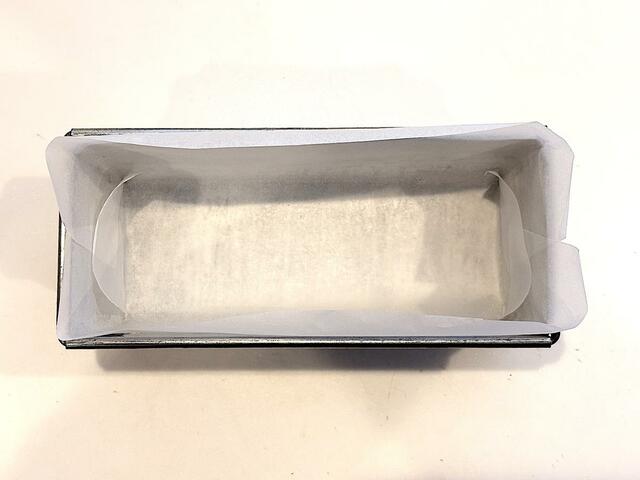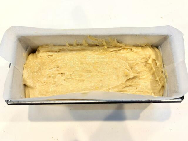8. オーブンシートを敷いておいた型に生地を流し、180℃に予熱したオーブンで35分〜40分焼く。真ん中に竹串を刺してみて生地がつかなければ焼き上がり。