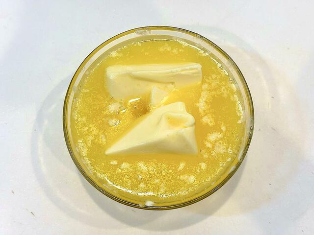 1. 室温に戻していたバターを耐熱容器に入れて、500Wのレンジに1分かける。バターが半分以上溶けている状態でレンジから出し、全体が溶けるまでそのまま置いておく。
