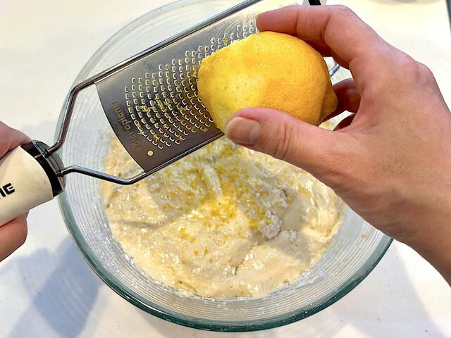6. レモンの皮をおろし金で削りながら加えさっくりと混ぜる。皮の部分を少し残しておき、焼いたケーキの上からすりおろしてトッピングにするのもおすすめ。