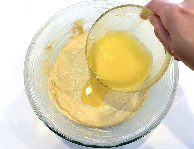 7. 1で溶かしておいたバターを3回に分けながら5に混ぜる。バターの筋がなくなり、つややかな生地になるまで混ぜる。