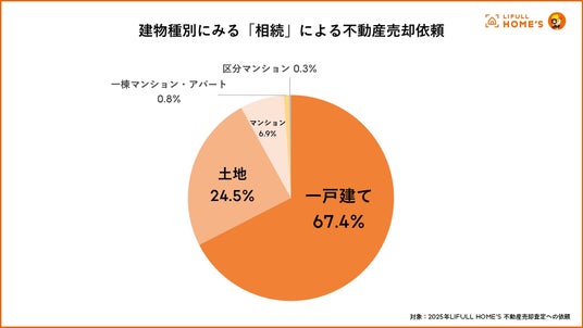 2025年の「相続による不動産の売却」を物件種別でみると、「一戸建て」が67.4%と約7割、「土地」が24.5%で、合わせて約9割(91.9%)と多くを占めています。親世代が住んでいた一戸建てや、所有している土地を相続により売却する動きが加速していると考えられます。
