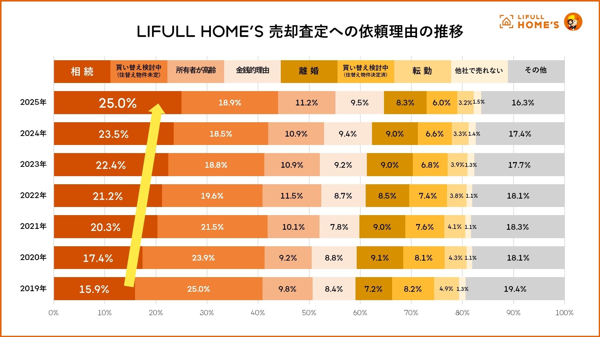 ご両親の逝去や介護施設への入居などを契機として相続・管理する不動産=実家を売却することを前提に査定に出すケースが年々増加しています。毎年LIFULL HOME'Sに寄せられる売却査定依頼も件数自体が増加しているだけでなく、その中で「相続」を理由としたものが2025年には25.0%に達し、3年連続して最多シェアを占有。まさに団塊の世代が全員75歳以上の後期高齢者となり、本格的に“大相続時代”に突入していることを反映したものと言えます。