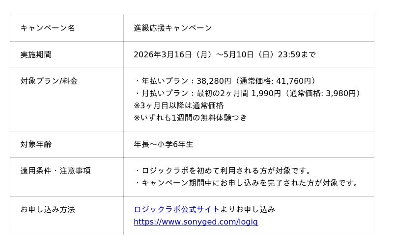 株式会社ソニー・グローバルエデュケーション(代表取締役社長:加藤直樹)が開発・提供する、年長から小学生を対象とした思考力を育む学習アプリ「LOGIQ LABO(R)(ロジックラボ)」は、2026年3月16日から5月10日までの期間限定で、「進級応援キャンペーン」を実施いたします。期間中に対象条件を満たしてお申し込みいただいた方は1週間の無料体験後、2か月半額でご利用いただけます。