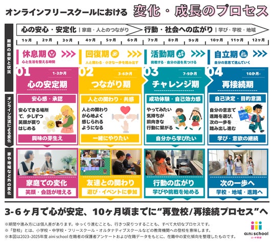 株式会社ガイアックス(本社:東京都千代田区、代表執行役社長:上田 祐司、証券コード:3775)が運営するオンライン・オルタナティブスクール「aini school(アイニースクール)小・中等部」は、在籍中の保護者アンケートおよび退会者データ(計215名分)を分析し、不登校の子どもが「心の安心」を土台として社会復帰へと向かうプロセスを実証データと共に発表いたします。