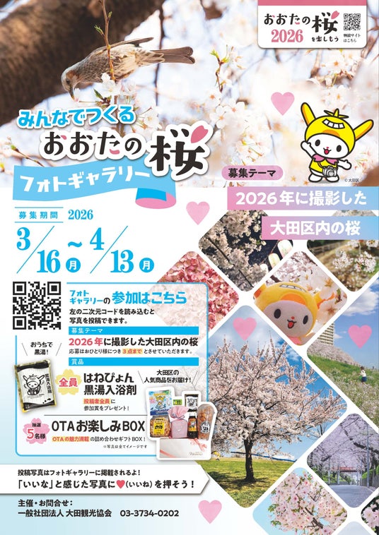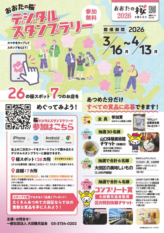 一般社団法人大田観光協会は、今年も「おおたの桜を楽しもう2026」を開催します。区内各所の桜スポットを巡るデジタルスタンプラリーや写真投稿企画など、春を満喫できる多彩なイベントで、おおたの魅力を再発見してください。