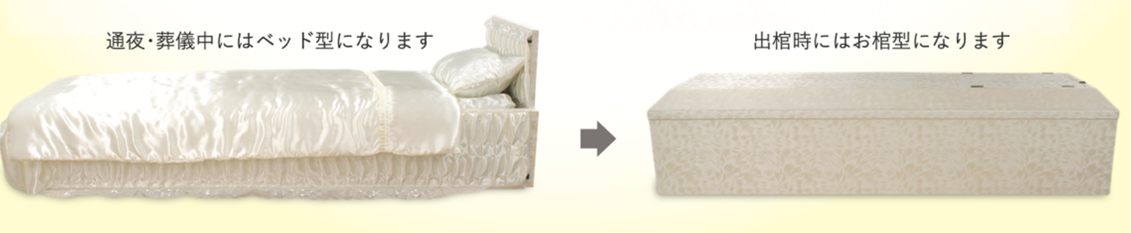 故人と参列者の心理的距離を縮めることで、お別れをより温かいものにできるのではないかと考え、オリジナル棺「ラストベッド」が生まれました。箱型の棺では、参列者が故人の顔を見たり声を掛けたりする際には、必ず上から覗き込むことになります。ラストベッドでは、いつものようにベッドで寝ている故人に話しかけるように、お別れをすることが可能です。