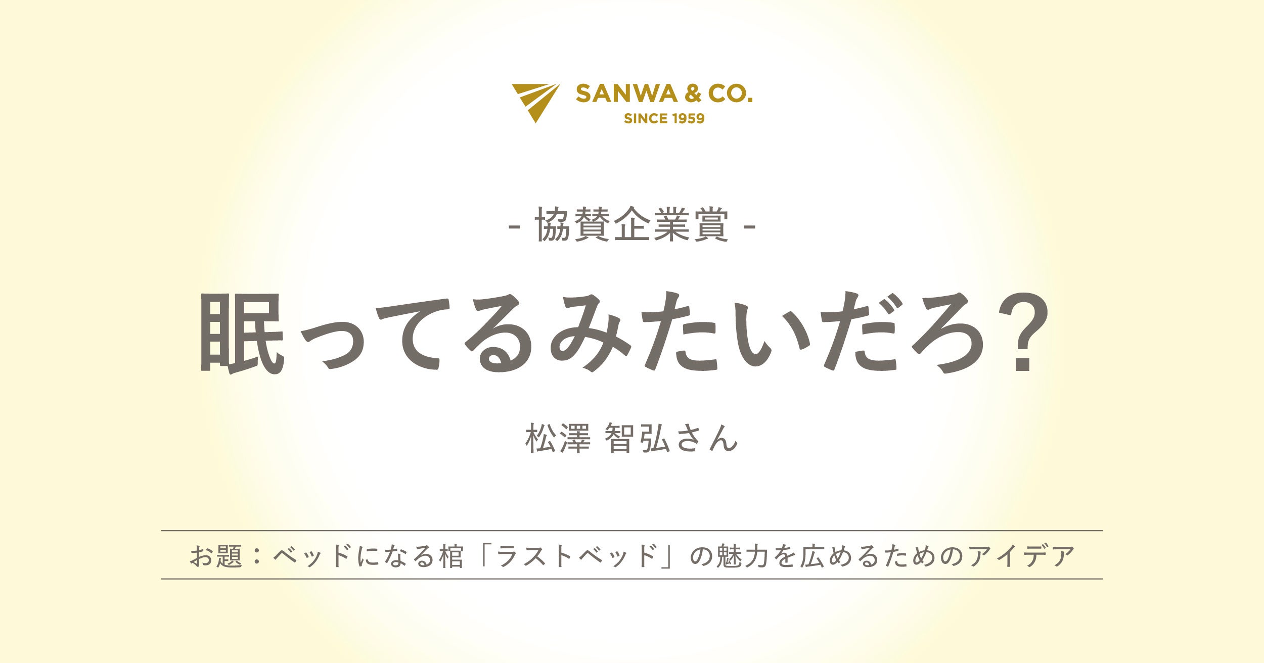 「ベッドになる棺、どう思いますか?」といった問いかけに寄せられた多数アイデアの中から、当社は協賛企業賞として松澤智弘さんによるコピー「眠ってるみたいだろ?」を選出しました。ラストベッドが提供する、故人と同じ目線で最後の時間を過ごすことができるといった価値を一言で表したコピーであった点。さらには、日常生活の中でも自然に用いられるような飾らない言葉の中に、ラストベッドを通じて当社が提案したいと願ってきた「つながりが実感できる新たな別れのカタチ」が示されている点を評価し、協賛企業賞として選出しました。