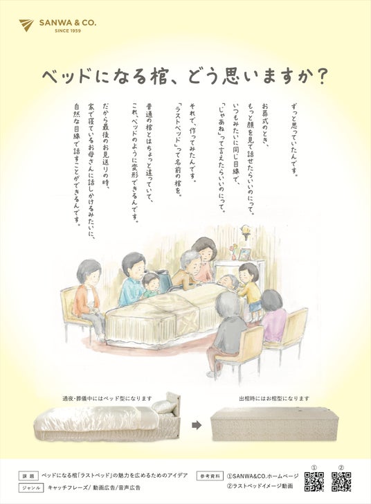 この度は第63回「宣伝会議賞」において、三和物産の課題に関心をお寄せいただき誠にありがとうございました。日頃あまり意識することのない「棺」。さらにはそれが「ベッドになる」という、一見すると想像しづらいテーマにもかかわらず、興味を持ってご応募くださった皆様に、心より御礼申し上げます。