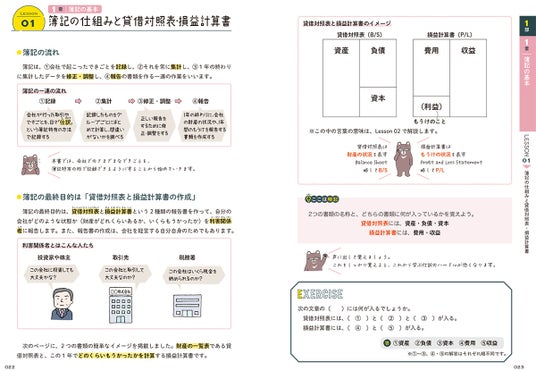 2級、3級ともに教科書はオールカラーで、図解やイラストも豊富に掲載しているため、視覚的に理解しながら学ぶことができます。また、基礎知識や専門用語もやさしいイラストで解説しているため、直感的に理解でき、つまずきにくいのが特長です。特にシリーズ内でも人気の「3級教科書」では、【お金がどこから来て、どこへ動くのか】を可視化。簿記の実務を知らなくても、「いま何が起きているのか」が自然と理解できるよう構成されています。