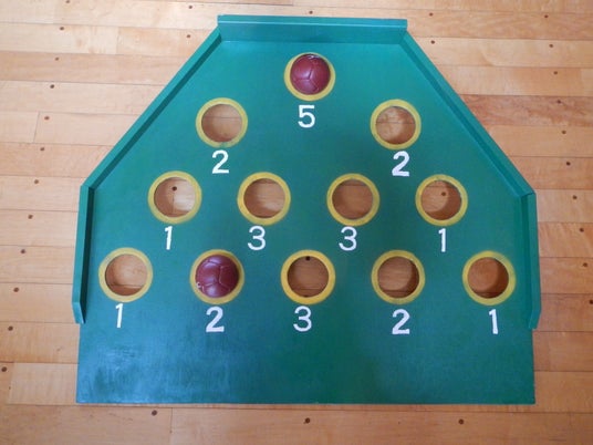 ボッチャを体育で行っていたが、得点が生徒にとって分かりにくく、ルールも難しい。そこで、スカットボールの台を基礎アイディアとしてボッチャボールを使って、穴に入った合計点で競う競技の教材を作成した。また、点数計算をExcelと電子黒板を使って、点数をわかりやすくした。