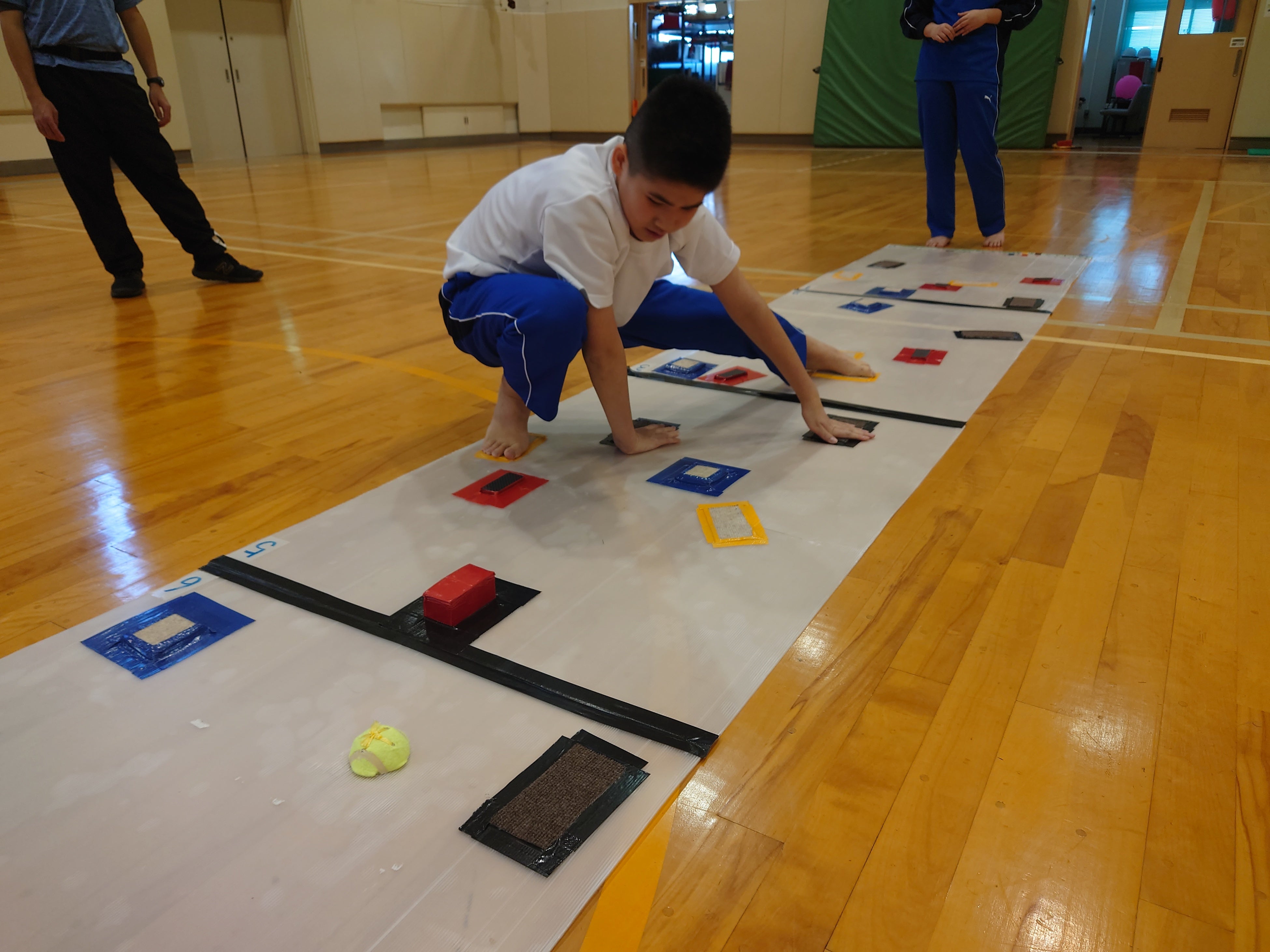 私は、全日制高校、ろう学校を経て、現在は盲学校の体育教員をしています。これまでの教育現場では、視覚障害や聴覚障害に加え、知的障害、肢体不自由、発達障害など、さまざまなニーズをもつ子どもたちと関わってきました。関わりの中で、「どんな子どもでも、安全に、楽しく、そして自分のペースで挑戦できる運動教材を作りたい」という思いを強くしました。さらに、近年では障害の有無にかかわらず、運動能力の格差が広がっている現状があり、誰もが一緒に参加できるユニバーサル教材の必要性を感じています。そんな折、オリンピックで活躍する日本人選手のスポーツクライミングの姿に感銘を受け、この競技の特性をヒントに教材開発を始めました。スポーツクライミングは、全身の筋力だけでなく、知力、持久力、体幹、握力、柔軟性、バランス感覚、ボディイメージ力など、さまざまな力が求められます。これらの要素を取り入れつつ、誰でも安全に楽しみながら、みんなと一緒に個々の力を伸ばすことが本教材のねらいです。本教材(コース版)は、縦2m・横1m程度のプラ板6枚を使用し、そこに2色で色分けされたマークを固定します。マークは、カーペット生地、発泡スチロール、段ボール、テニスボールなど、異なる素材と大きさで作成しました。2色のうち1色は「手マーク」、もう1色は「足マーク」とし、使用者は右手・左手・右足・左足のうち3つ以上を常にマークに乗せるというルールがあります。また、一度使ったマークには再度触れてはいけません。このルールの中で、どの順番で手足を動かすか、次の動きをどう考えるか、姿勢をどう保つかなど、楽しみつつ自然に運動能力や思考力を育むことができる教材です。このコース版以外にも簡易版、インクルーシブ版があります。