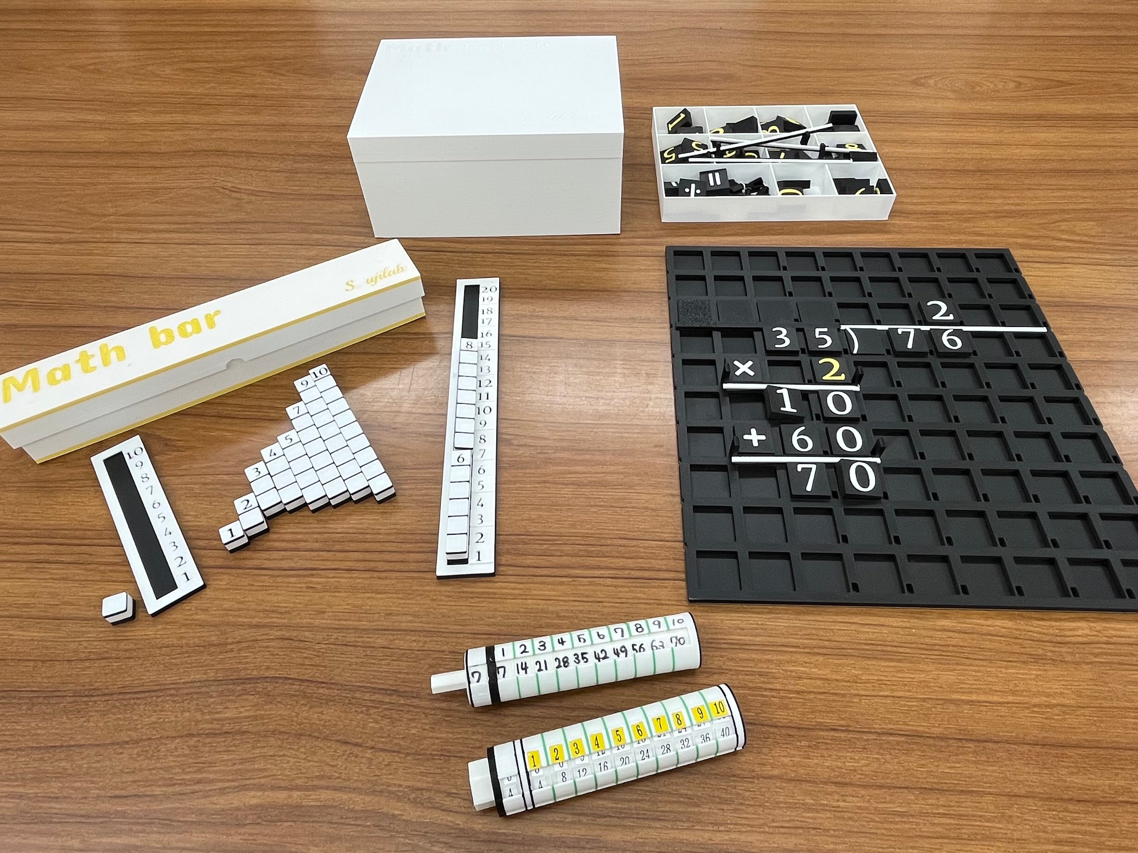 発達障害のある小学生の算数指導をする中で、生まれた3種類の教材で構成されています。(1)MathBar(マスバー)は、数の合成分解をブロックの操作によりサポートすることをねらいとした、数ブロックとスリットで構成された教具です。(2)MathPad(マスパッド)は、たし算、ひき算、かけ算、わり算の筆算をブロックの操作によりサポートすることをねらいとした数字ブロック、記号ブロック、小数点、横線とそれらを配置する板で構成された教具です。(3)九九Bar(ククバー)は、九九の想起をサポートするペンシル型の教具です。これらの教具を組み合わせて利用することにより、数概念、数操作、計算手続きの理解や流暢性を促すことを目的としています。