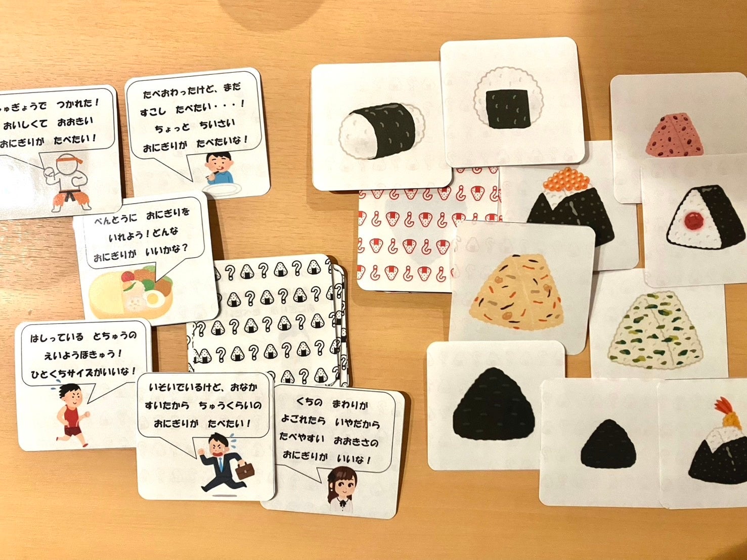 親が引いたカードに書かれたお題に沿ったおにぎりカードを自分の手札から出します。親は、どのカードが最も最適かを選び、最後選ばれた回数が最も多い人が勝ちというカードゲームです。「〇〇なおにぎり」と、曖昧な文章に適したものというだけでなく、親がそのお題に対して、どのようなおにぎりがよいと考えているのかまで推理する必要があります。答えがはっきりしていないので、適したもの、さらには親の考えまで推理する必要があり、楽しみながら、抽象概念や相手の思いを想像する力を育てられると思い、作製しました。