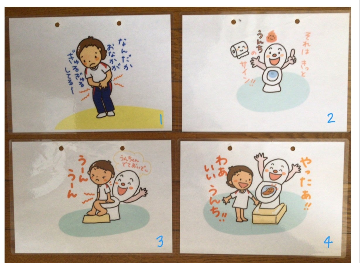 特別支援学校に在籍するお子さんたちは、排尿の自立はしていても、トイレで排便できないお子さんが多くいます。その理由は、さまざまで、部屋の隅で隠れてしたり、便意があるとわざわざオムツに履き替えてからオムツの中でしたりする子もいます。また、トイレでしたときに水がお尻にかかってしまい、それにびっくりしてからトイレでできなくなったという子もいました。うんちをする絵本は存在しますが教育として使える内容のものは少ないと感じます。そこで、トイレでうんちをすることへの心理的なハードルが少しでも下がるといいなと思って創作しました。