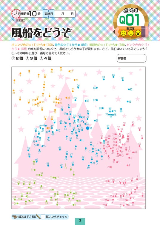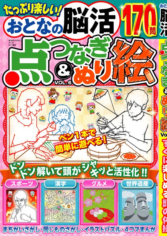 「点つなぎ」「ぬり絵」を中心に「まちがいさがし」「同じものさがし」「イラストパズル」「迷路」など、誰でも飽きずに楽しめる全170問を掲載。