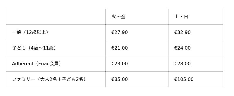 ※その他、10名以上の団体割引や、特定の月内で有効な「Billet Open(日付未指定券)」も販売されています。