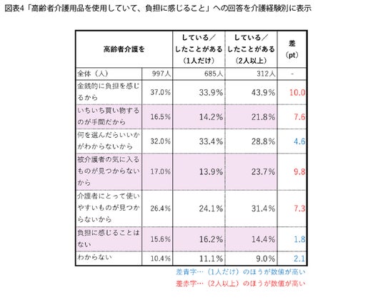 介護経験が1人だけか、2人以上かで分けて見ると(図表4)、2人以上の経験がある人は、「金銭的に負担を感じるから」「被介護者の気に入るものが見つからないから」「いちいち買い物するのが手間だから」「介護者にとって使いやすいものが見つからないから」と回答した人の割合が高くなっています。