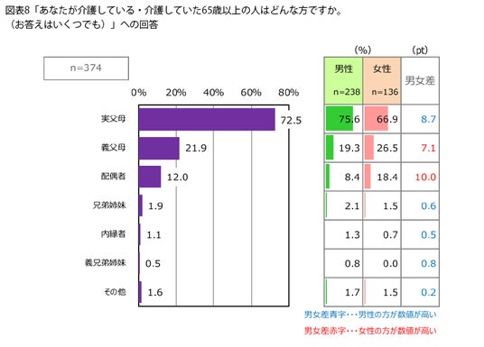 「実父母」は男性のほうが8.7pt高く、「義父母」は女性のほうが7.1pt高く、「配偶者」も女性のほうが10.0pt高くなっています。
