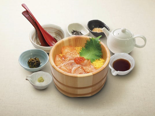 真鯛を贅沢におひつに敷き詰め、いくらをトッピングし、3種の小鉢を添えた一品!締めには、当店自慢の“特製だし”をかけて、だし茶漬けとしてお愉しみください。