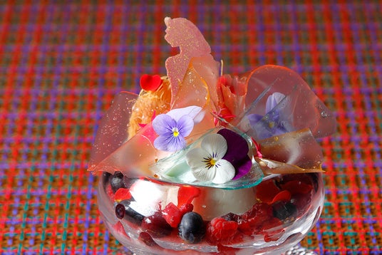 デザートのトップには、クレオパトラを象ったチョコレートを飾り、その周囲には、ベリーダンスヴェールのようなピンクやブルーなどの華やかなフリル状の装飾を施しました。グラスの中には、美と知性、そして魅惑の象徴として知られるクレオパトラにインスピレーションを得たミックスベリーとハイビスカスのジュレ、ドライフルーツとハチミツを合わせたムースグラッセ、そしてヨーグルトで構成。さらにエジプト菓子「クナーファ」に用いられるカダイフをアクセントとして加え食感の変化も楽しめます。横に添えたローズソースで、香りと味わいを引き立てる華やかで優雅なデザートです。