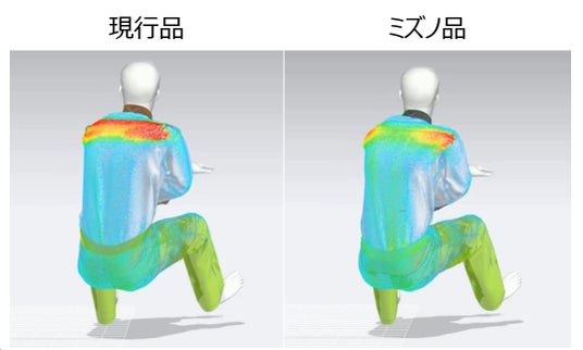 運転時の肩回りの引きつれや圧迫感を比較したイメージ図 赤くなるほど引きつれや圧迫感を感じやすい 『CLO Virtual Fashion, Inc. owns all rights to the avatar displayed. https://www.clo3d.com/』