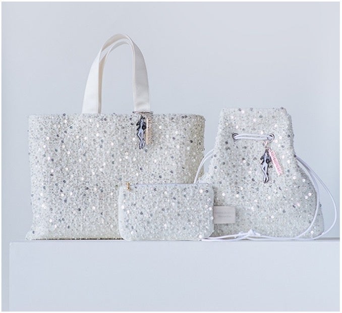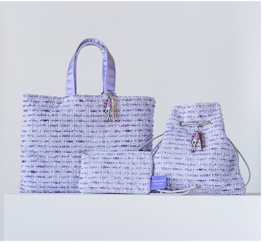 今回のコラボレーションでは、宝塚歌劇の華やかな舞台衣装をイメージさせるパールやスパンコールをあしらったホワイトのツイード生地と、宝塚らしい“すみれの花”をイメージした優雅なパープルツイード生地の2種を展開。トートバッグ、巾着バッグ、フラットポーチの各3アイテムをラインアップしました。