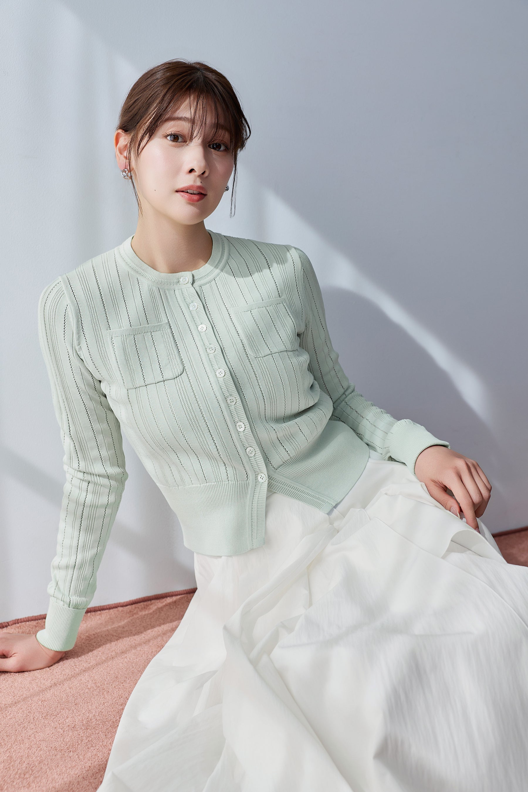 リブ、タック柄、アイレットを緻密に組み合わせた立体的な編地が特長の一着で、春カラーで構成された5色はどれもスタイリングの差し色にぴったり。