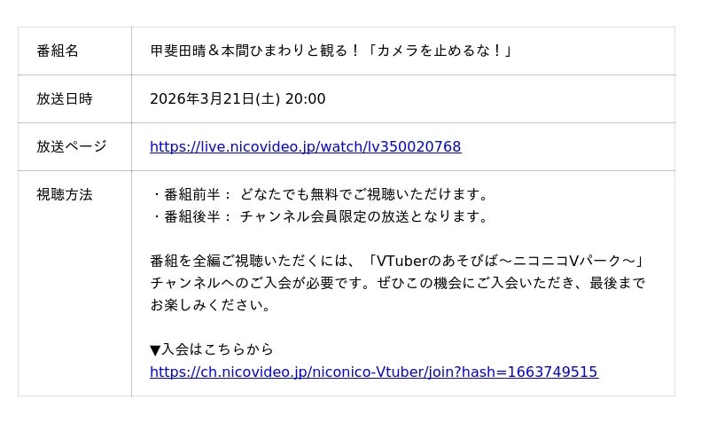 株式会社ドワンゴが運営するニコニコ公式チャンネル「VTuberのあそびば~ニコニコVパーク~」の人気生放送番組「VTuberと観る!映画実況シリーズ」に、にじさんじ所属 甲斐田晴、本間ひまわりの出演が決定いたしました。